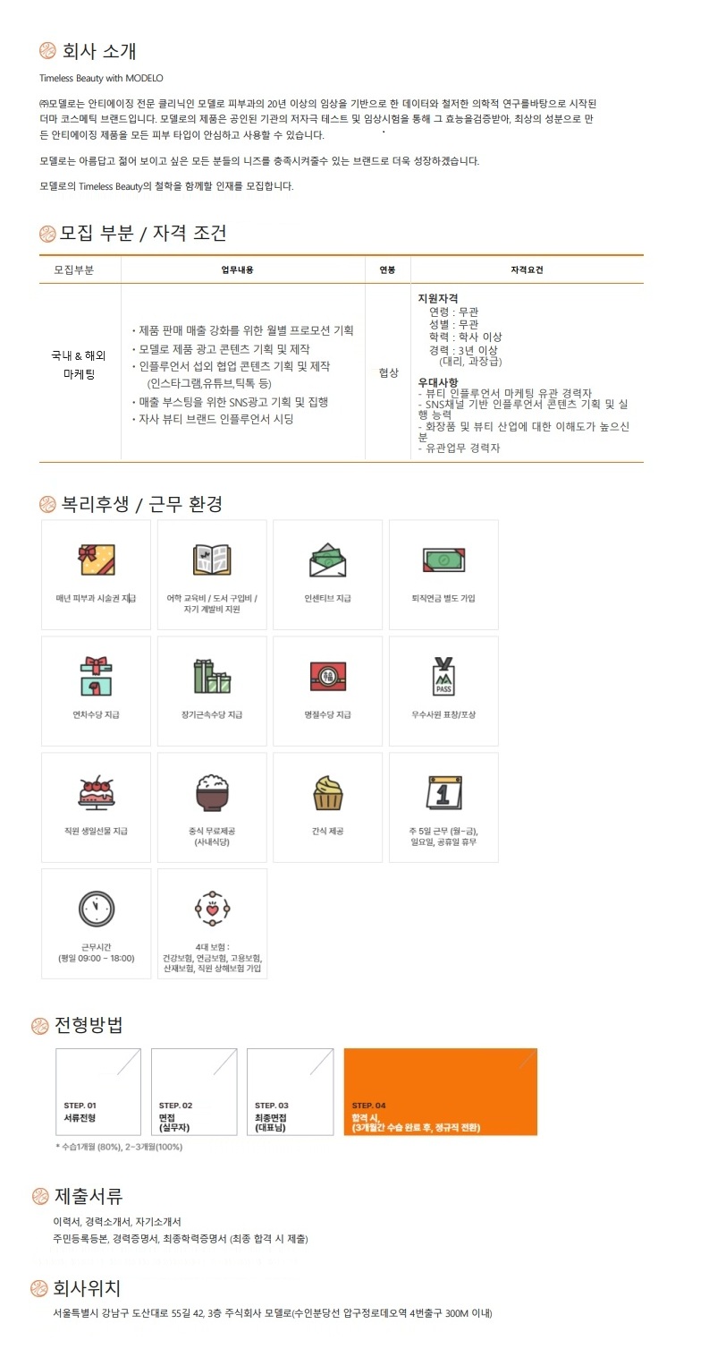 | Timeless Beauty with MODELO ㈜모델로는 안티에이징 전문 클리닉인 모델로 피부과의 20년 이상의 임상을 기반으로 한 데이터와 철저한 의학적 연구를바탕으로 시작된 더마 코스메틱 브랜드입니다. 모델로의 제품은 공인된 기관의 저자극 테스트 및 임상시험을 통해 그 효능을검증받아, 최상의 성분으로 만든 안티에이징 제품을 모든 피부 타입이 안심하고 사용할 수 있습니다. 모델로는 아름답고 젊어 보이고 싶은 모든 분들의 니즈를 충족시켜줄수 있는 브랜드로 더욱 성장하겠습니다. 모델로의 Timeless Beauty의 철학을 함께할 인재를 모집합니다. |
