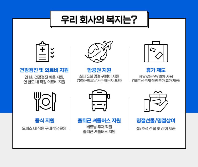 • 근무 환경 : 휴게실, 회의실, 전용사옥, 노트북, 사무용품 지급, 비자 발급 지원